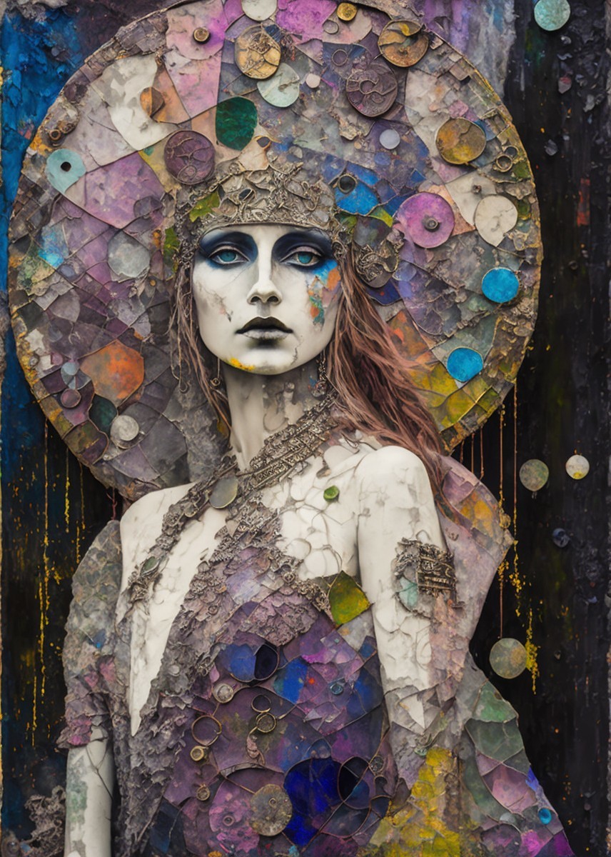 Stylized portrait with geometric patterns and a muted color palette, featuring a halo-like element behind the figure's head.
