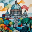 A vibrant, stylized artwork depicting a grand dome structure surrounded by colorful clouds, trees, and a flowing river, blending geometric shapes and rich hues to create an enchanting scene.