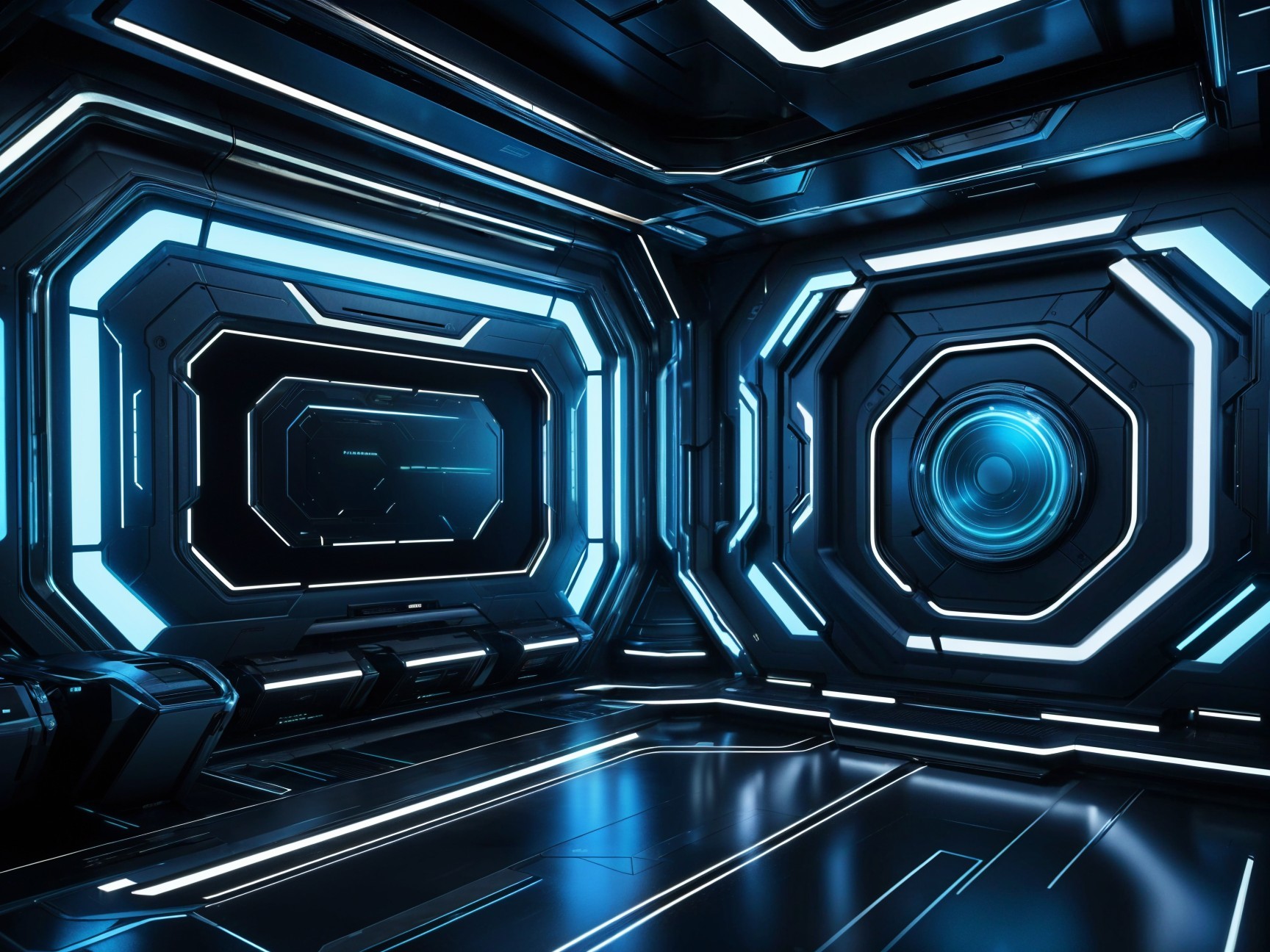 A futuristic, sleek corridor features dark metallic surfaces illuminated by glowing blue and white lines, creating a high-tech, sci-fi atmosphere. The design emphasizes depth and technological intrigue.