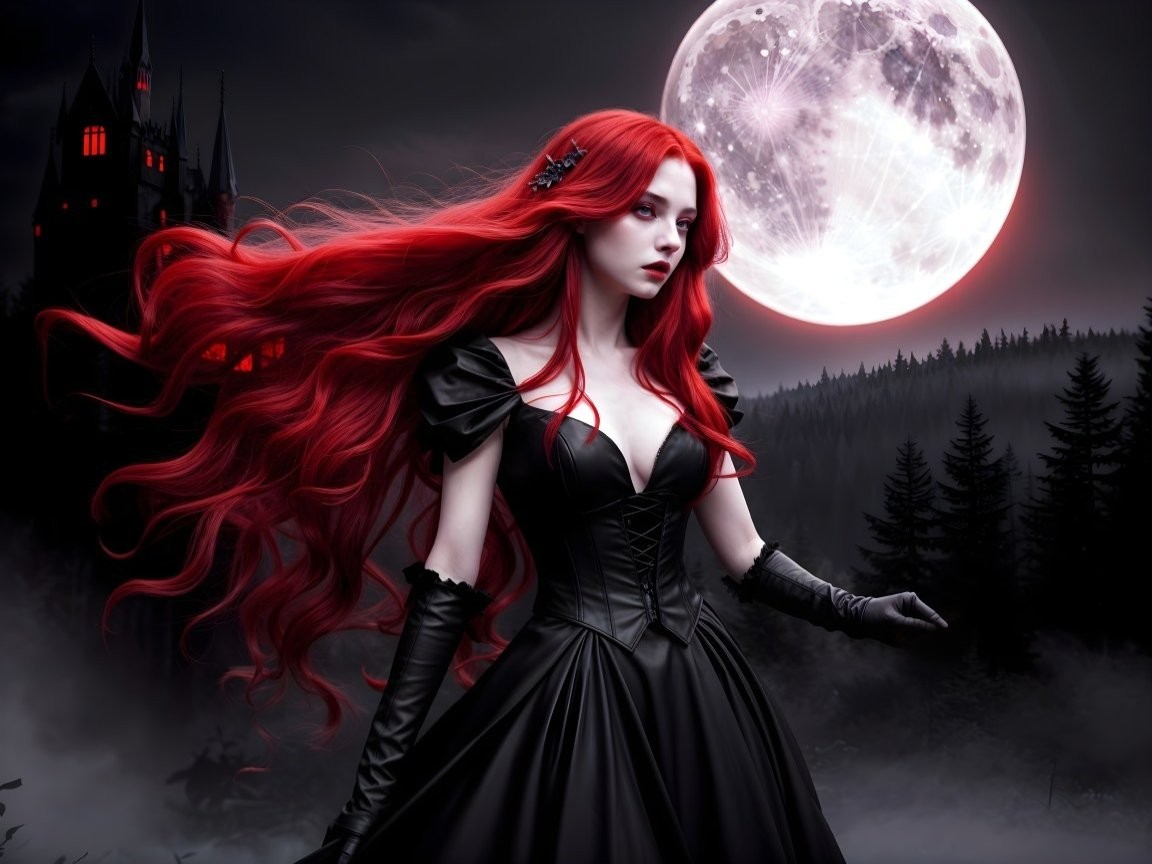 A striking figure with long, flowing red hair wears an elegant black gown. She stands against a mysterious forest backdrop, illuminated by a large, glowing moon, creating an enchanting atmosphere.