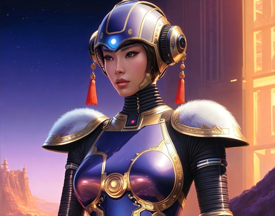 A digital artwork of a futuristic asian female warrior with sleek armor and a helmet, set against an otherworldly cityscape and sky.
