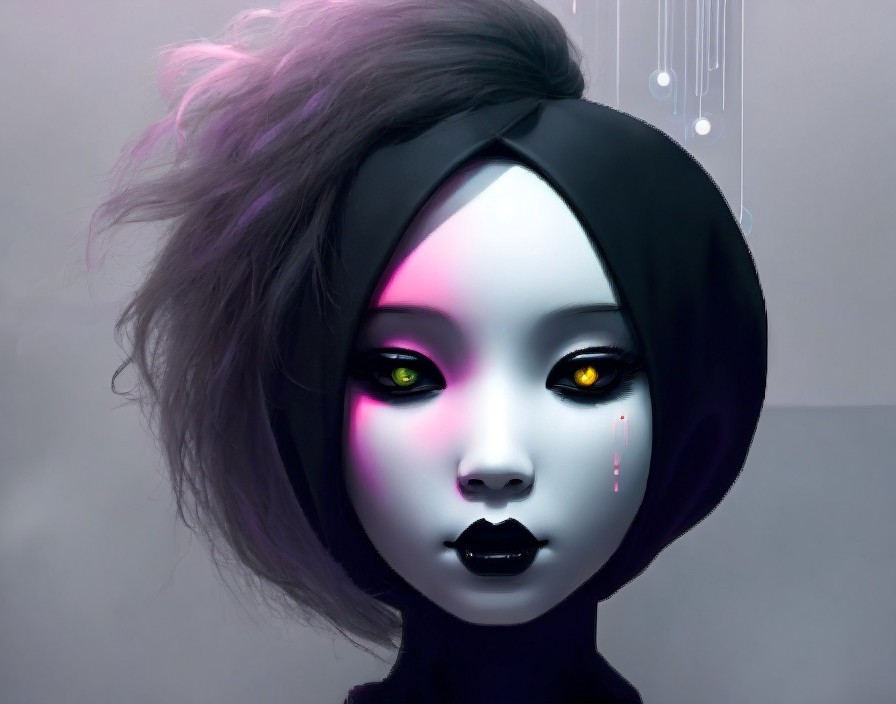 Character portrait with obscured face, intense eyes, dark lips, and headwrap.