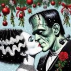 A glamorous couple stands close together in a snowy scene. The woman, dressed elegantly, gazes at the muscular man, who is partially shirtless, evoking a sense of romance and holiday magic.