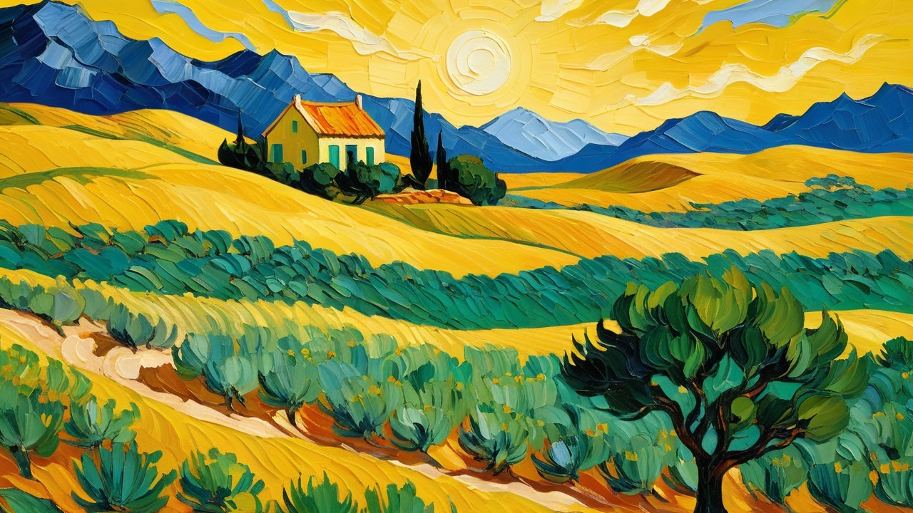 A vibrant, impasto painting in the style of Van Gogh depicts a sun-drenched rural landscape. Rolling hills of bright yellow fields dominate the foreground and midground, textured with visible brushstrokes creating a sense of movement. Interspersed within these fields are rows of light green, rounded bushes, forming
