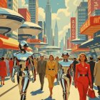 A vibrant street scene with pastel-colored buildings and whimsical umbrellas shading pedestrians. People stroll leisurely, dressed in vintage attire, under a bright, clear sky with fluffy clouds.