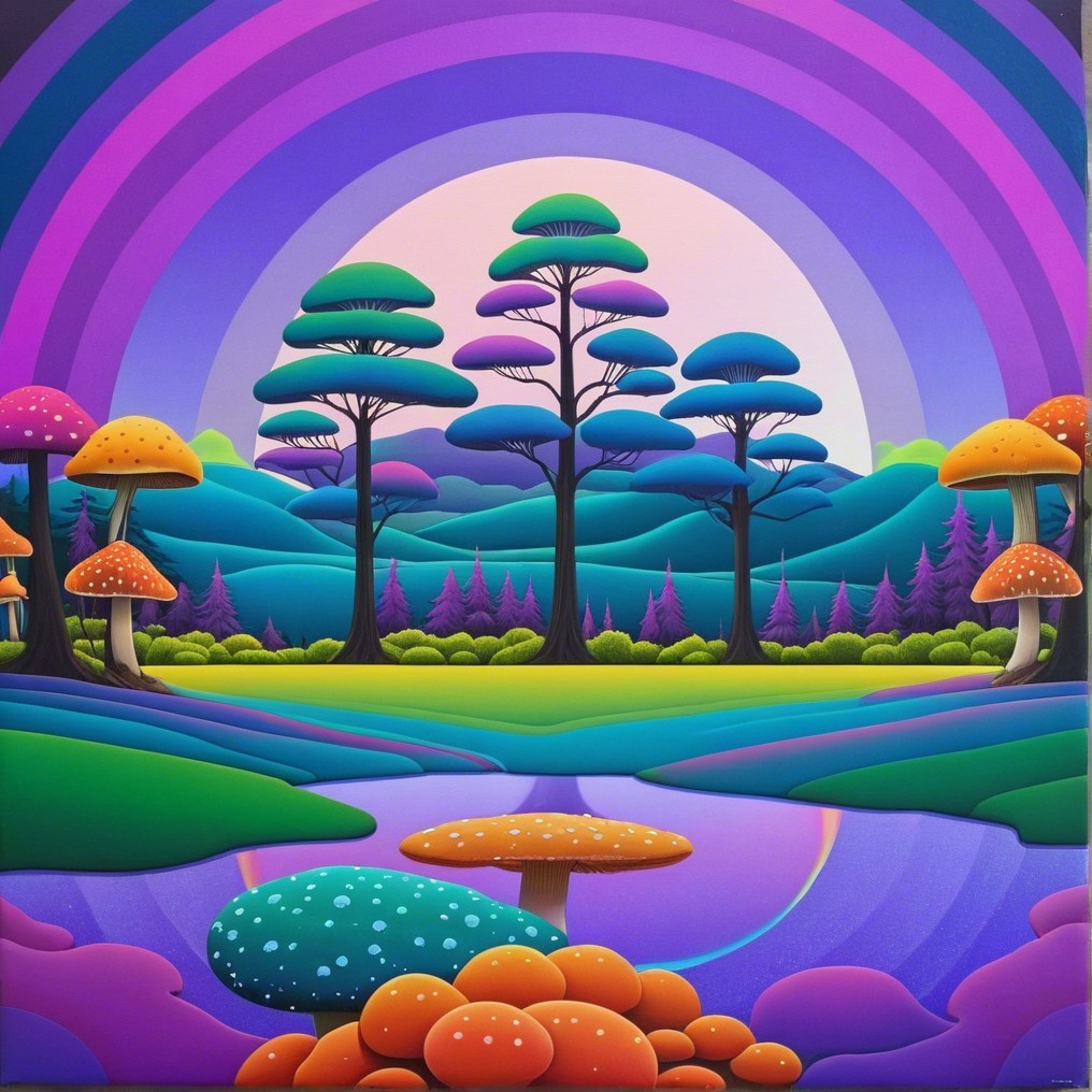A vibrant, surreal landscape featuring colorful mushrooms, tall trees, and rolling hills under a gradient rainbow sky, creating a dreamlike, whimsical atmosphere by a tranquil water body.