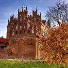 A stunning castle-like building with intricate architecture, featuring tall spires and ornate details. Surrounded by vibrant autumn foliage, the scene is illuminated by a clear blue sky.