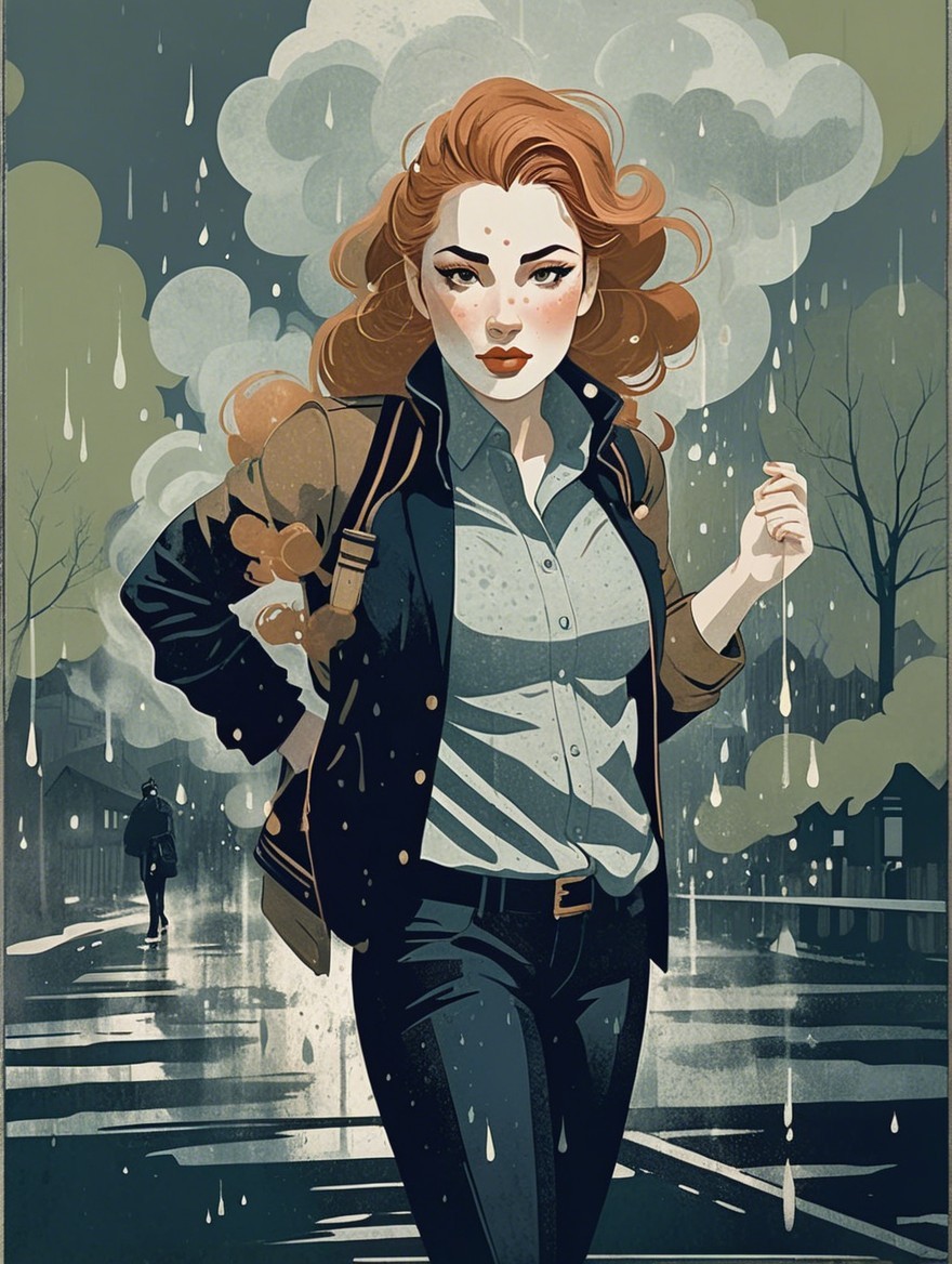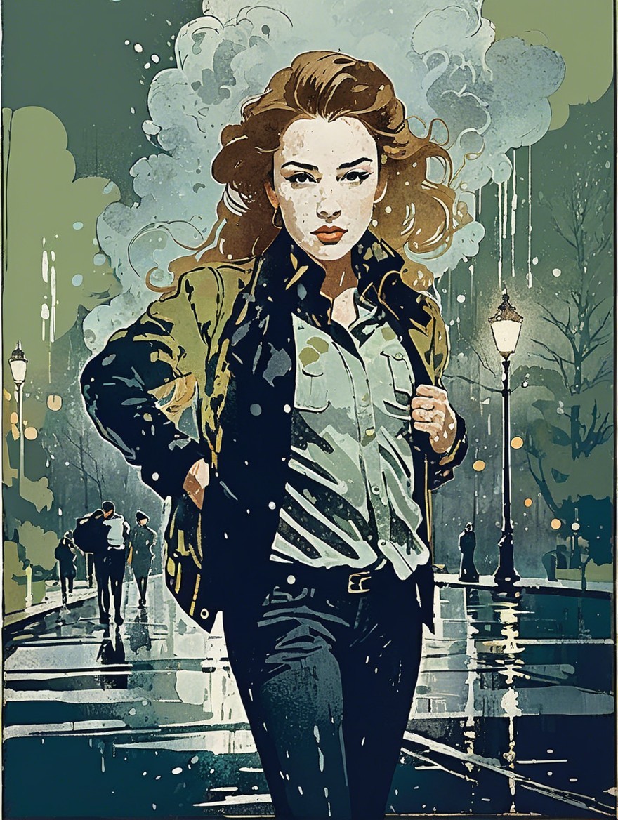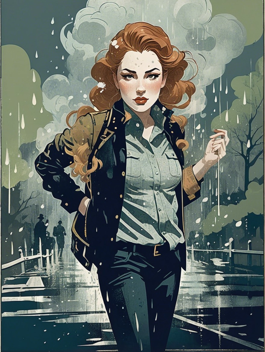 Prompt: Exquisite 3/4 body portrait featuring a buxom female from a top-to-bottom view, hues, dyed, cel-shaded, slightly exaggerated features. The artwork blends woodblock print elements with storybook illustration art, showcasing a sculpted, muscular figure in muted colors. Embrace the rule of thirds for visual depth, creating an ethereal atmosphere with bokeh effects, fog, rain, dripping details, flecks, splashes, and smoke. The glossy piece is unfiltered, cel-shaded, and baroque, with divisionism and an unconventional color scheme.Crafted on a black canvas, the portrait is inspired by Stan Lee's style, incorporating luminism and phantasmagorical elements with intricate geometric patterns. Defined fine linework, pointillism techniques, luminosity 1.3, triadic color scheme of beige, black, and vibrant emerald green. Raindrops and tiny outlines add depth, while the portrait is stylized by Albert Bierstadt, featuring stacked lines and glossy textures reminiscent of topographic graphics.The lighting is crucial, with rim lighting enhancing the shiny portrait scene against a detailed background with smeary patterns. Create a dark, moody atmosphere with irregular stroke, squiggly line art, intricate fine lines, ultra-filigree textures of fine lines. Channel the 1970s European comic art style with sensual erotic elements, captured through 135mm photography and splatter-painted nightsky details.This masterpiece exudes cinematic quality,precise Gelsculpt 64K, uhd, hdr, VFX-inspired, octane render illustration 1.5, comic book art, brightness 1.9, ambient occlusion 1.5