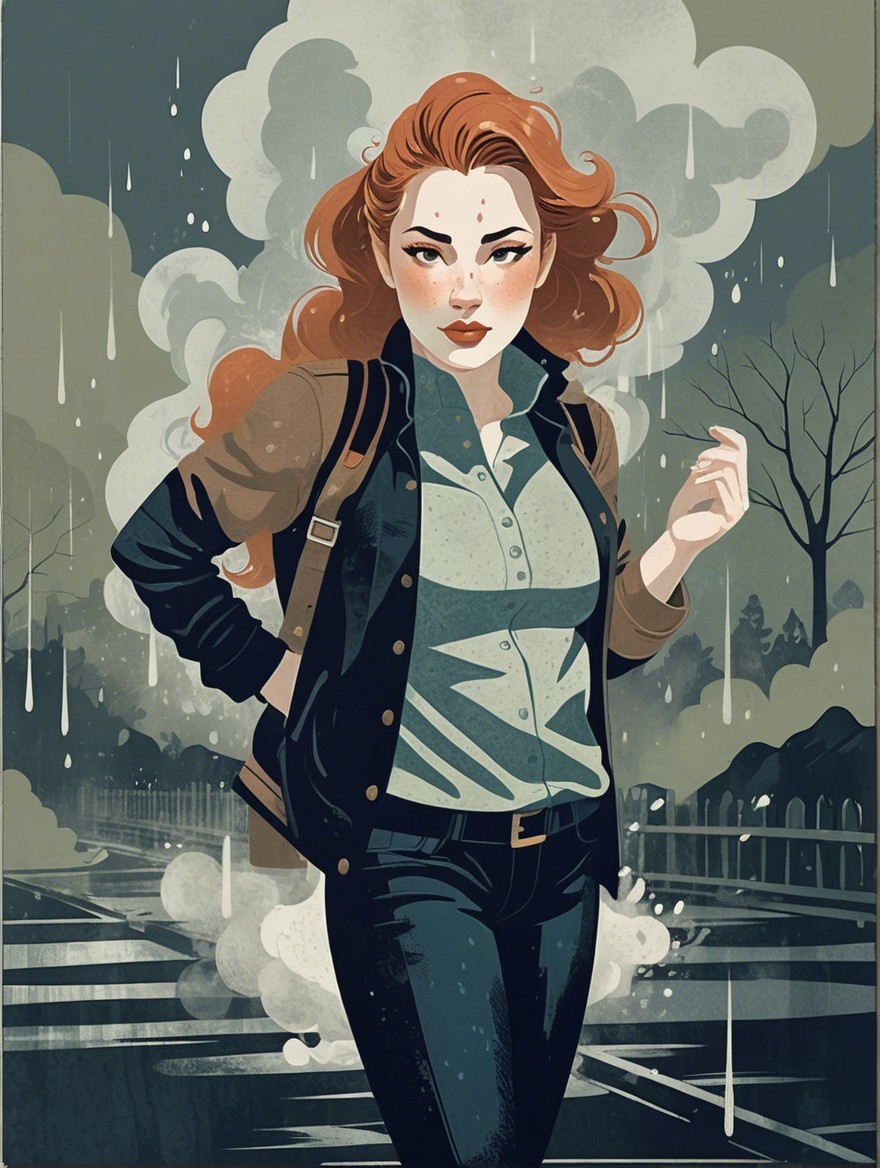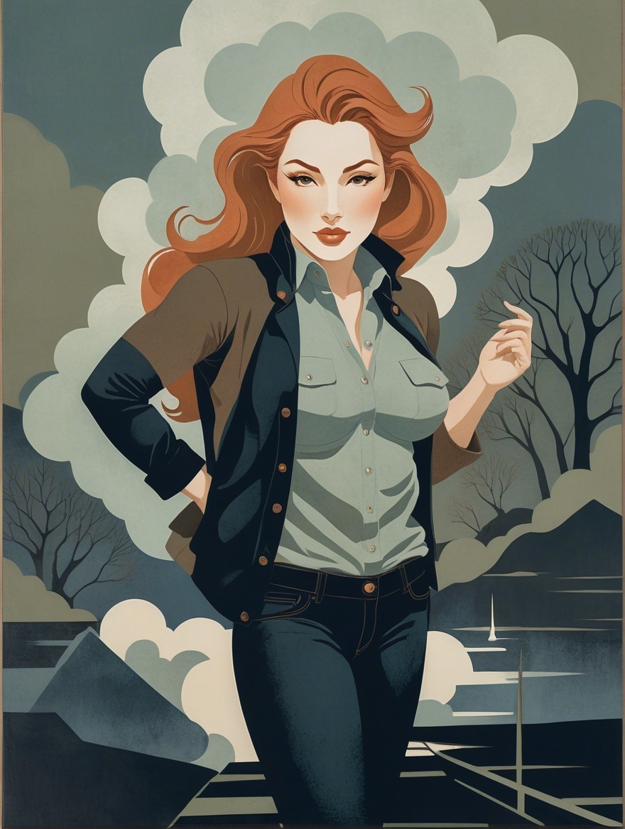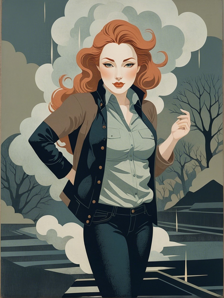 The image features a confident woman with vibrant red hair, wearing a fitted shirt and jeans, set against a backdrop of stylized clouds and trees, highlighting a sense of strength and empowerment.