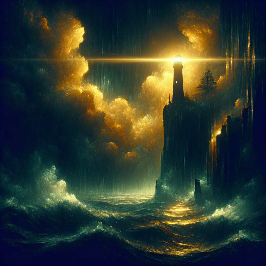 - **Lighthouse:** Positioned on the left, perched atop a steep cliff. The lighthouse is the only light source in the scene, casting a strong, intense yellow beam that pierces through the darkness. This light creates a stark contrast with the surrounding nocturnal environment, illuminating the turbulent sea and adding drama to the scene.