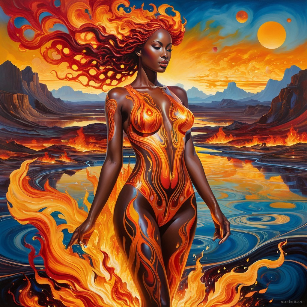 A mesmerizing portrayal of life on Venus, featuring a figure shimmering with oil and sweat. Surrounded by a vivid, surreal landscape, abstract flames and intricate patterns enhance the otherworldly allure.