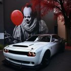 A white muscle car with a sleek design is parked in front of a vibrant mural featuring a clown with a sinister smile, surrounded by autumn leaves that add a pop of color to the scene.
