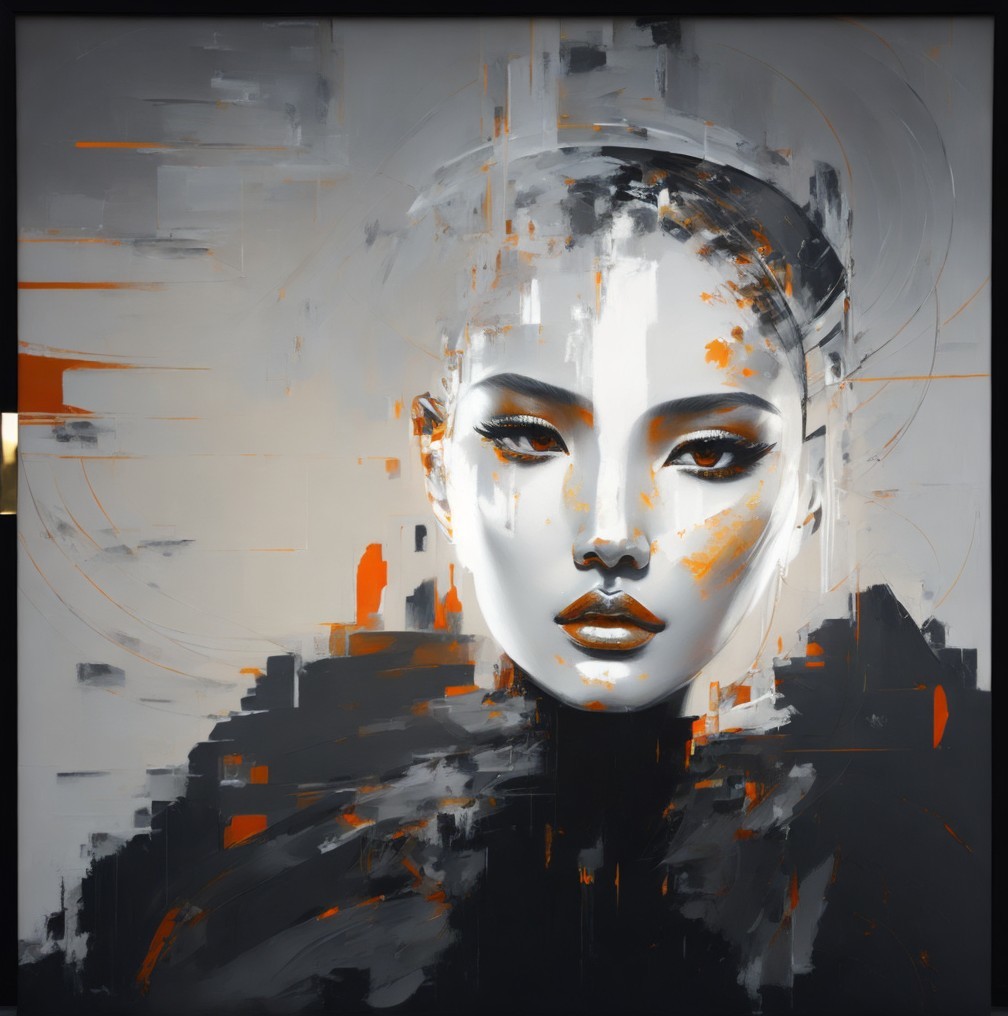 Abstract painting of a stylized woman's face with monochromatic tones and orange accents on a textured background.