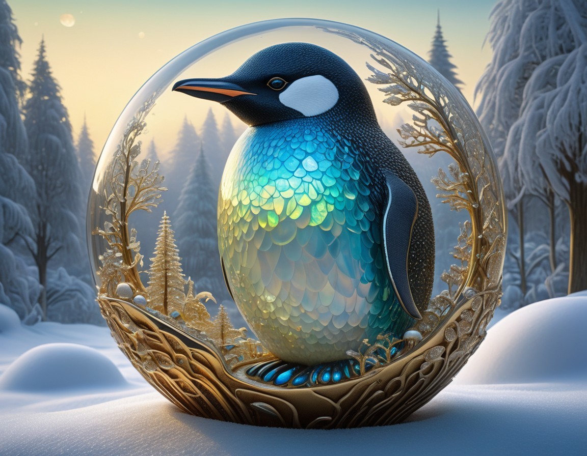 A stylized penguin encased in a glass sphere rests in a snowy landscape with golden wheat and frosty trees.