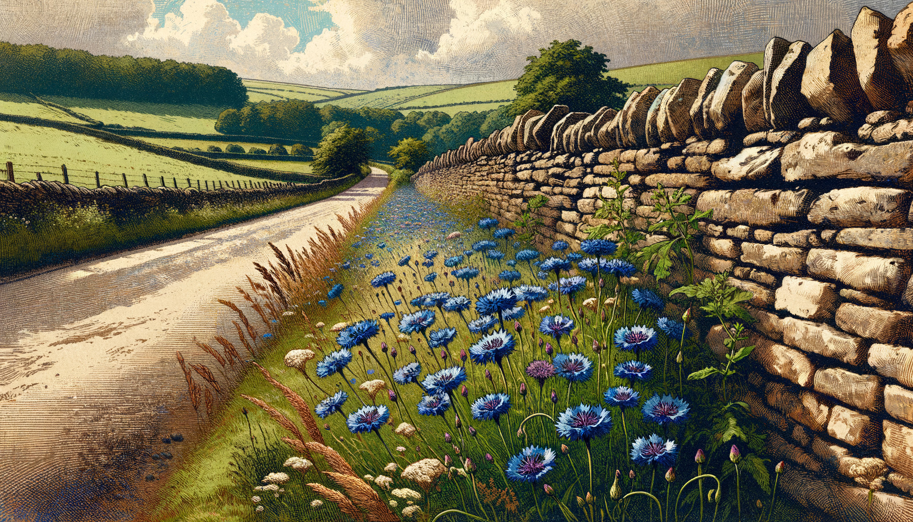 A vibrant illustration of a countryside with a path, stone wall, flowering plants in the foreground, fields, and trees under a blue sky.