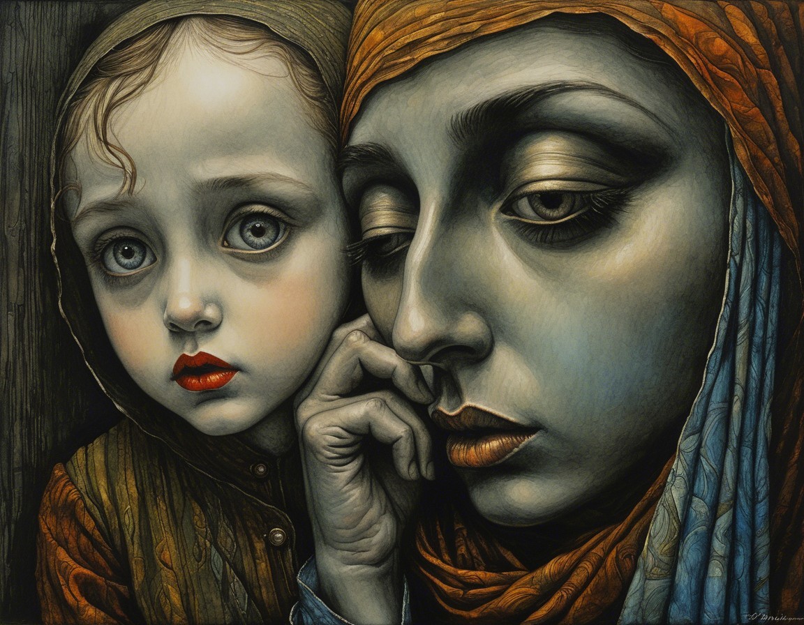 The image features a close-up of a woman and a girl, showcasing deep emotional expressions. The woman, with a golden headscarf, displays concern, while the girl looks apprehensive, emphasizing their bond.