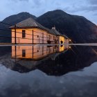 A serene lakeside cabin stands illuminated at dusk, surrounded by majestic mountains. The still water reflects the warm glow of lights, creating a peaceful and picturesque scene.