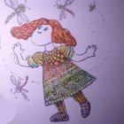 A cheerful girl with curly red hair wears a vibrant, patterned dress and striped socks. She joyfully spreads her arms amidst a flurry of colorful dragonflies surrounding her.