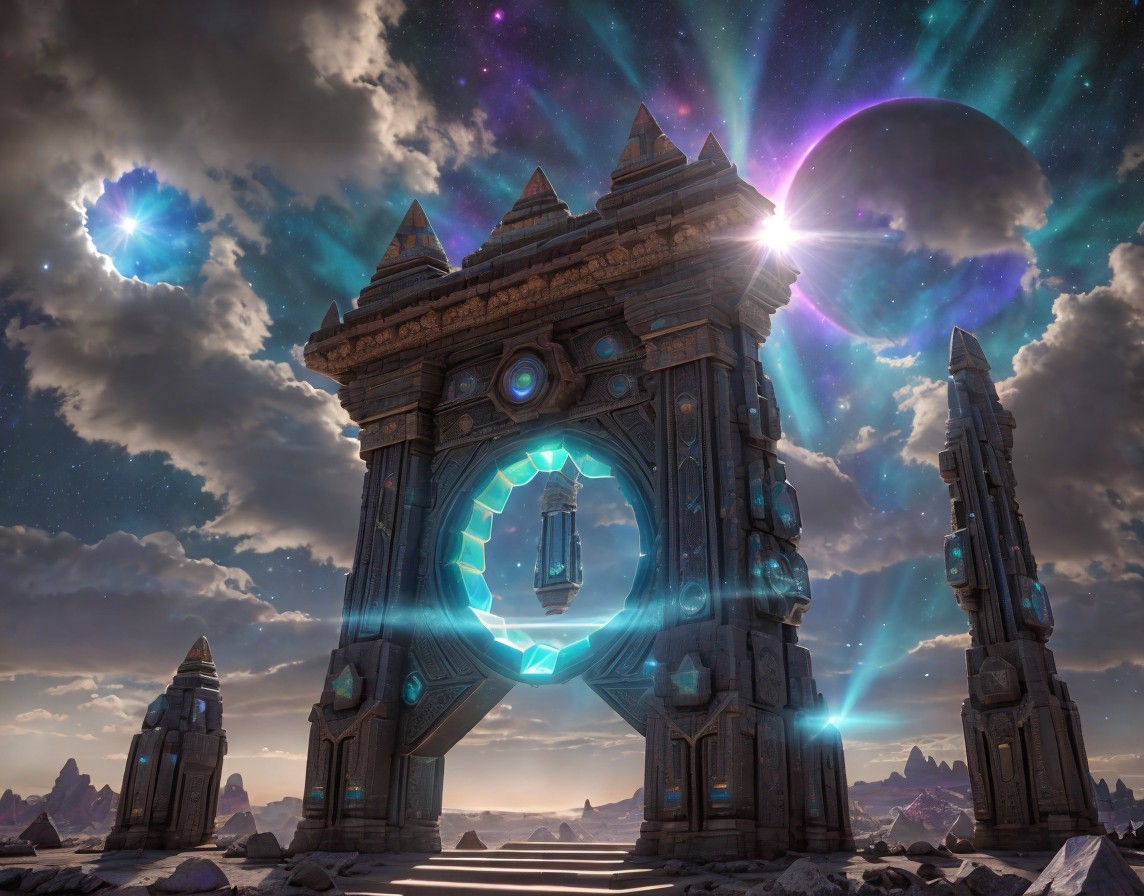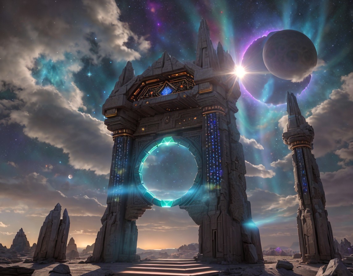 Ornate extraterrestrial Interdimensional gateway/portal made of stone on an ethereal cosmic platform with intricate alien glyphs and sacred geometric patterns and assimilated with advanced technology. Illuminated by magical phosphorescent crystals and hyperprisms. Stargate with hexagonal geometric patterns. The sun, moon, and planets amidst billowing nebula clouds in a vast cosmic sky. Ultra-realistic landscape beneath this complex celestial canvas, immersing yourself in the enigma of astral projection, alien contact, and surreal psychedelic vibes inspired by the sci-fi LSD art aesthetic. In the style of Cameron Gray