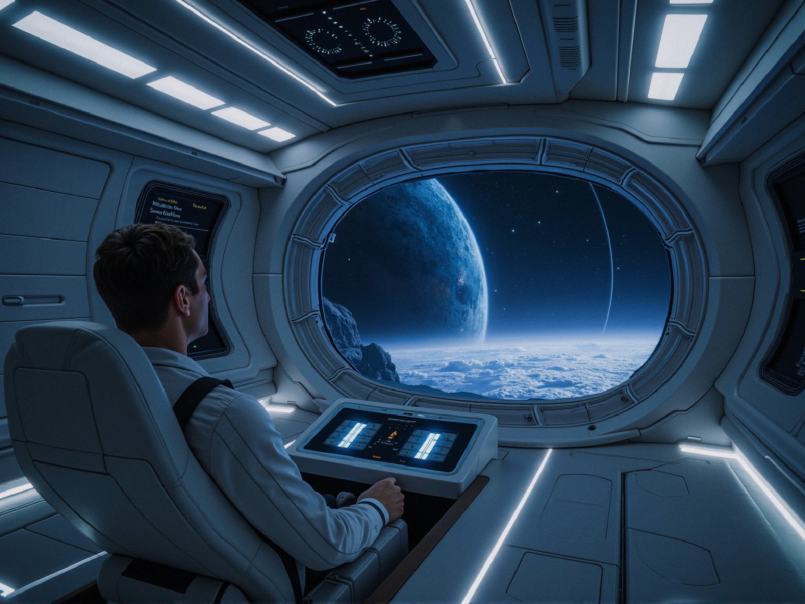 A futuristic spacecraft interior features a young person seated in a sleek chair, gazing out at a stunning cosmic view of a distant planet and starry backdrop through a large window.
