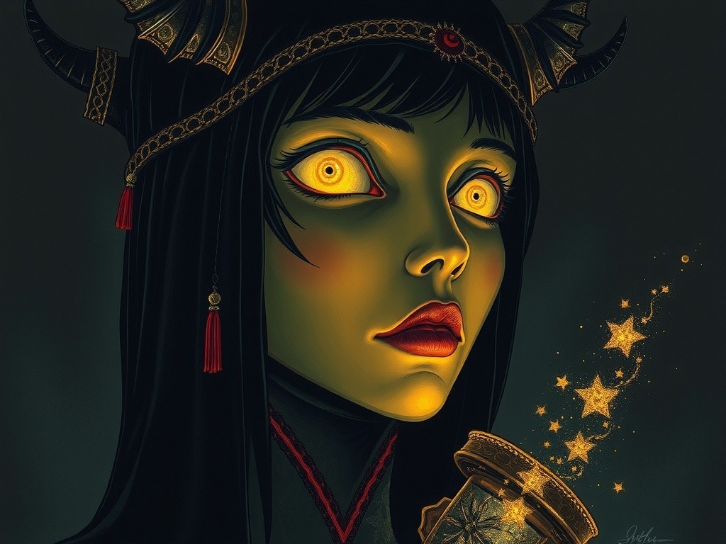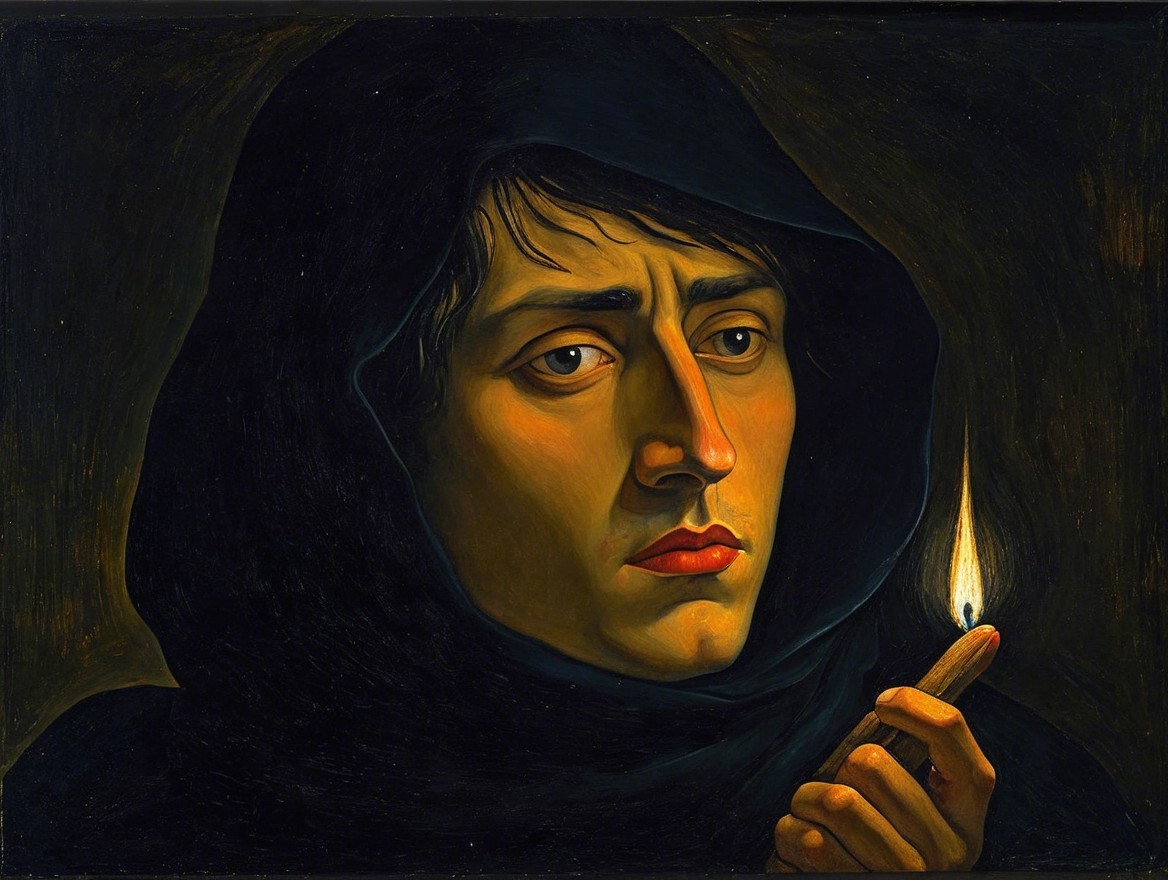 A somber portrait of a man in a dark hood, gazing intently. The background features a starry night sky with a crescent moon, enhancing the mood of contemplation and solitude.