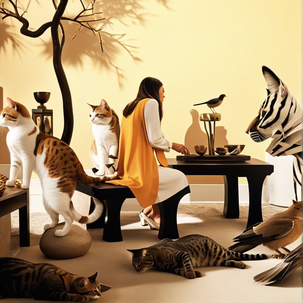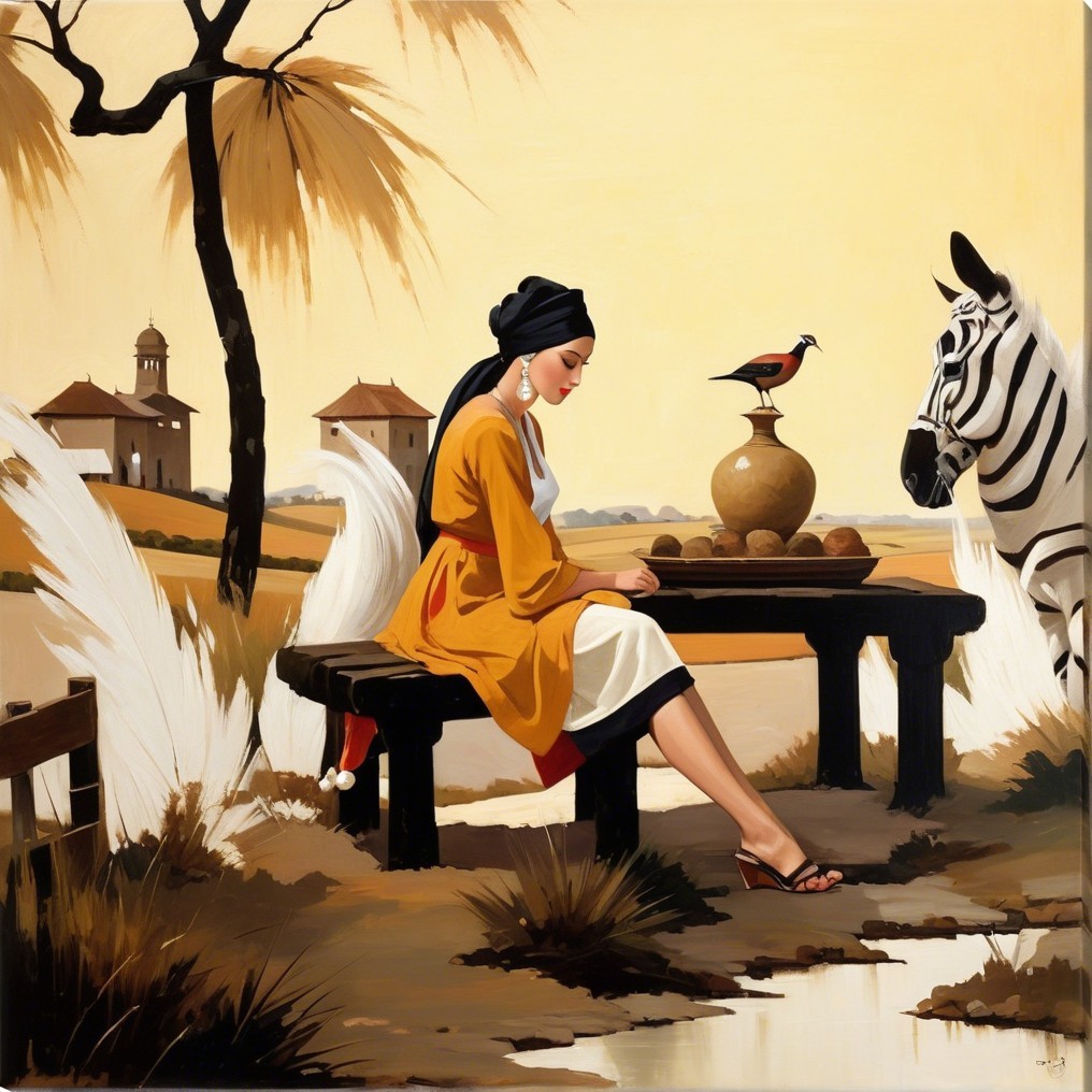 A graceful woman in an orange robe sits at a traditional piano, playing thoughtfully. Surrounding her are serene landscape elements, including trees and flowing fabrics, with a bird perched nearby.