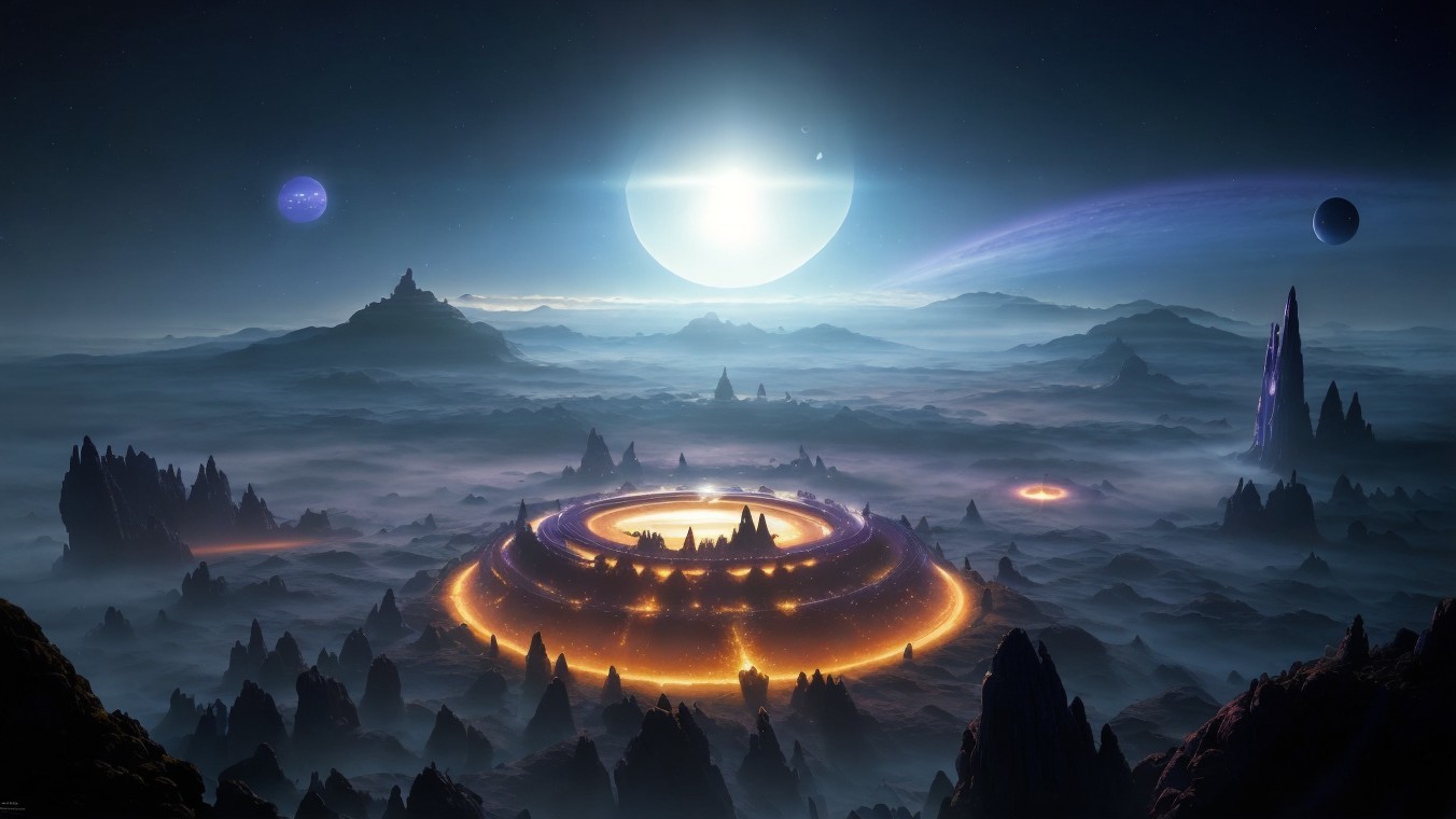 Prompt: "Science fiction landscape, landscape with violet and blue tones of a planet orbiting a white dwarf star in the scene an illuminated spherical fortress becomes important. Tim White style"