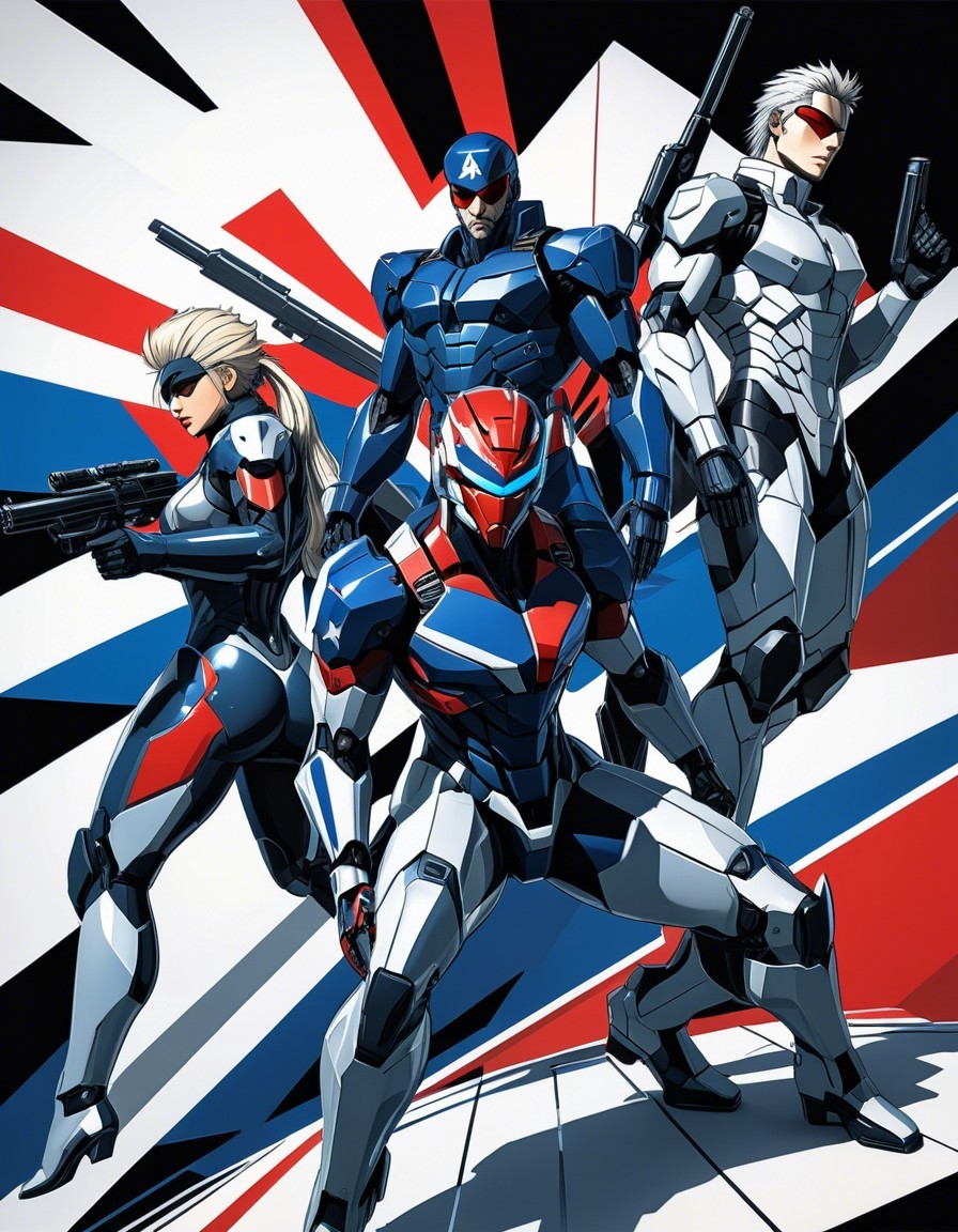 Prompt: metal gear trio,, dynamic pose, art deco, cel shaded, irregular angle view, organic tropic cybernetic with futuristic modern silver blue white red colors, patriotic themed, defined, neat, contrast, detailed, realistic badass 3d illustration, comics art/extremely-ultra-detailed line-art. The artwork features high contrast, colorful, striking detailed art style, outline, no text