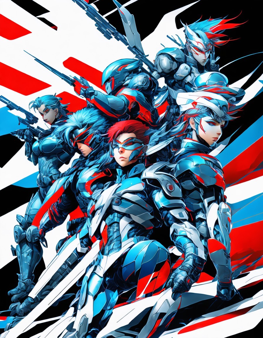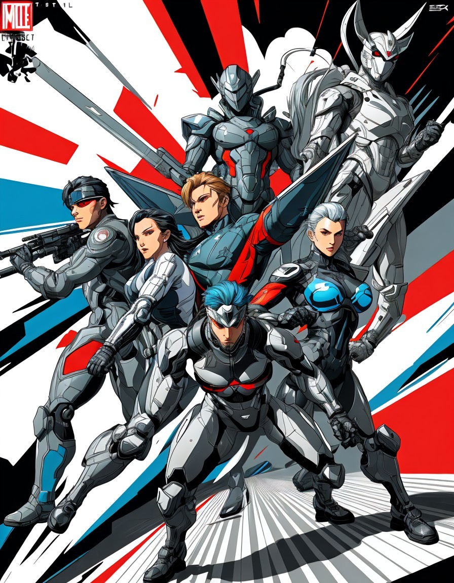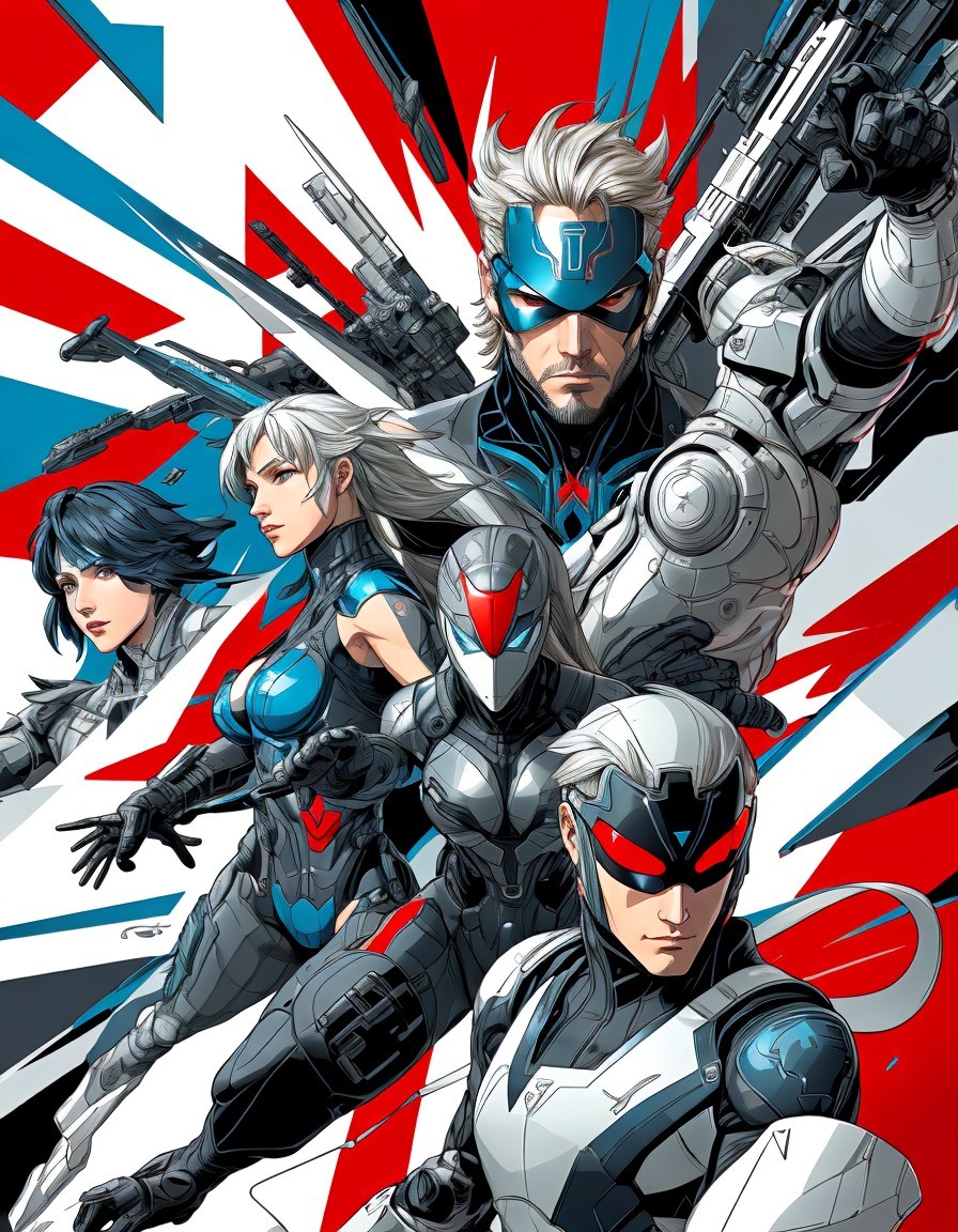 + Prompt:metal gear trio,, dynamic pose, art deco, cel shaded, irregular angle view, organic tropic cybernetic with futuristic modern silver blue white red colors, patriotic themed, defined, neat, contrast, detailed, realistic badass 3d illustration, comics art/extremely-ultra-detailed line-art. The artwork features high contrast, colorful, striking detailed art style, outline, no text
