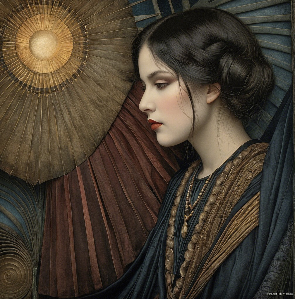 A young woman with long, dark hair is adorned in elaborate jewelry and a deep blue garment. She features a striking feathered headdress and has a serene expression, conveying elegance and strength.