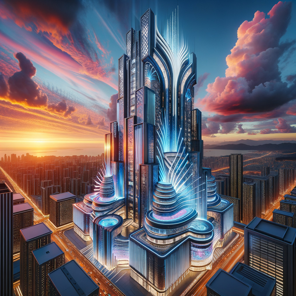A futuristic cityscape at sunset with towering skyscrapers, vibrant neon lights, and a dynamic sky with clouds.