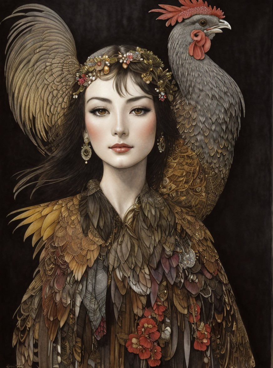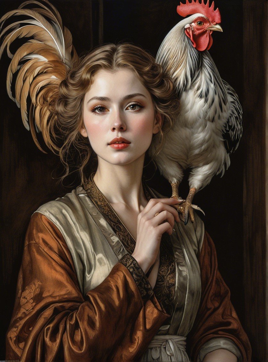 A young woman with elegant hair and a golden dress stands by a door, a white rooster perched on her shoulder, creating a charming and whimsical scene.