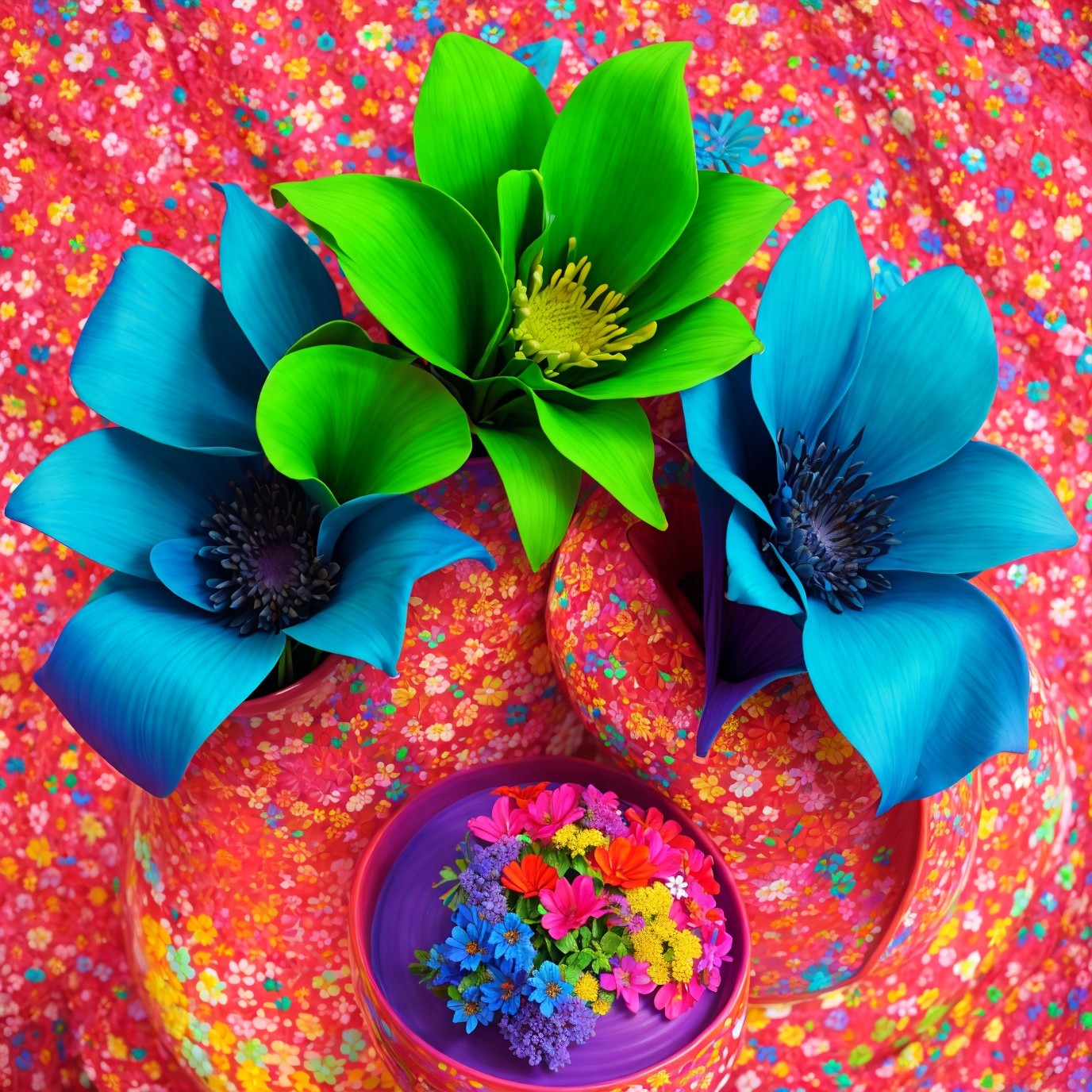 Vibrant artificial flowers in colorful pots against a multi-colored confetti background.