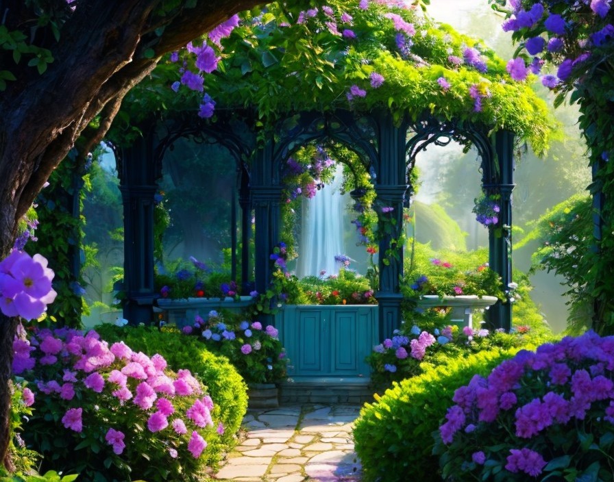 A lush garden with a flower-covered arbor, blooming hydrangeas, a cobblestone path, and a waterfall in the background.