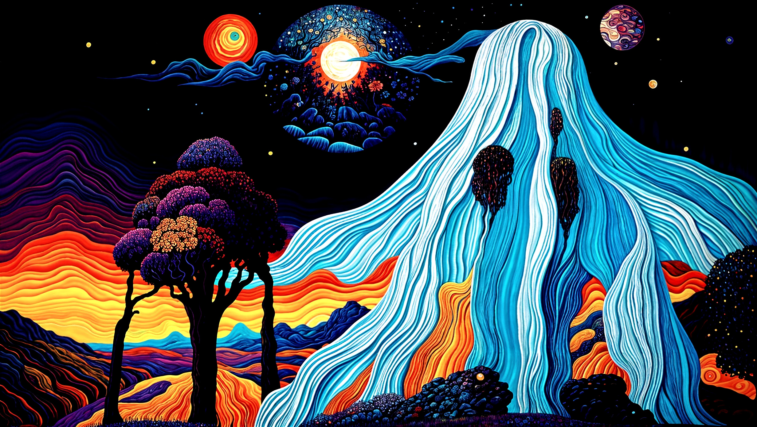 A vibrant, surreal landscape features two trees beside a flowing, ghostly figure. Colorful cosmic elements like stars and planets fill the sky against a backdrop of swirling hues and dramatic contrasts.