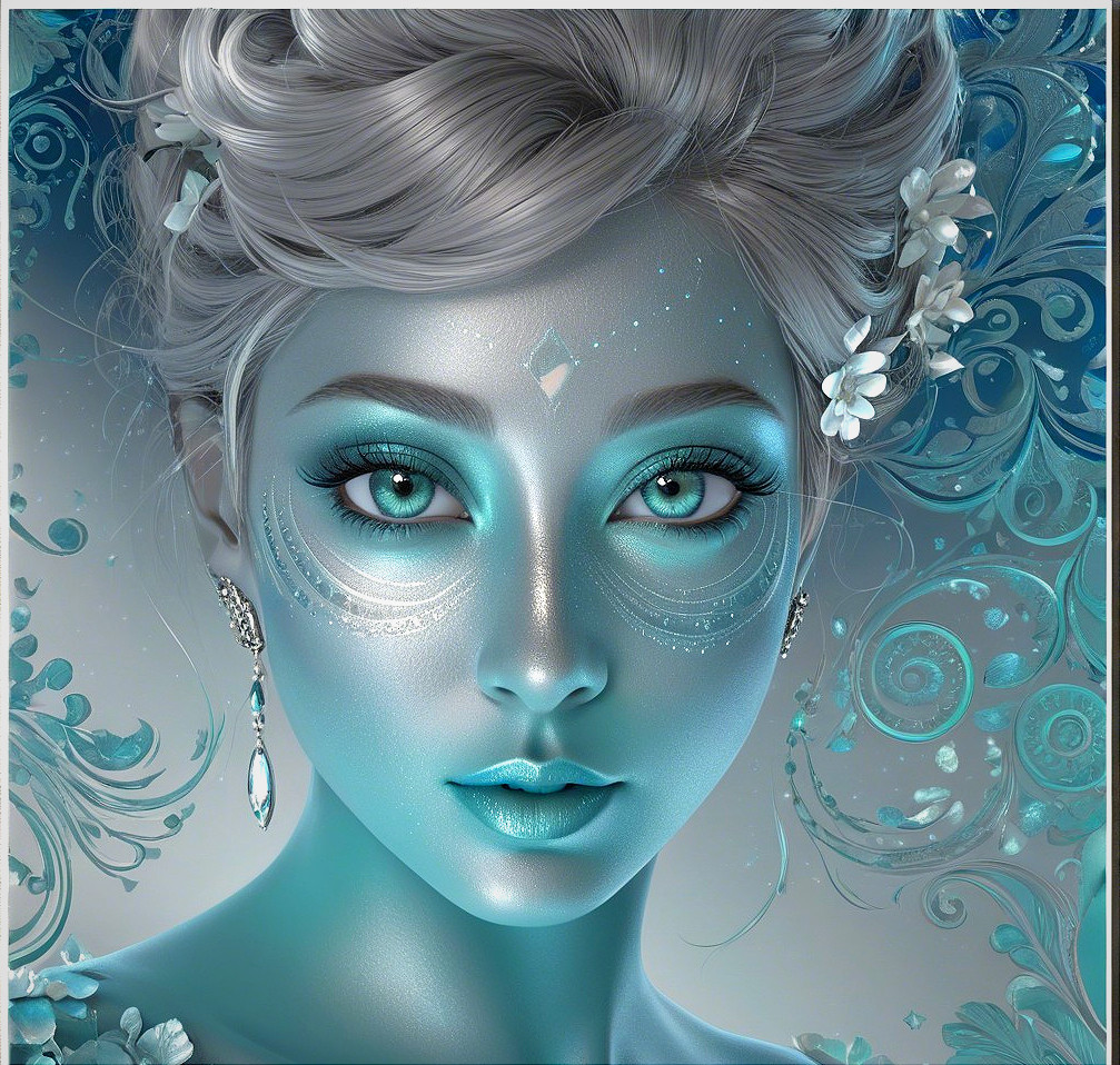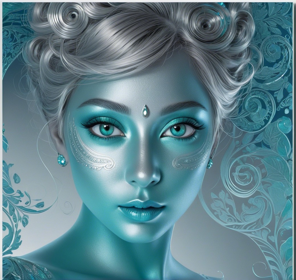 + Prompt:Digital Art portrait. Smooth metallic skin texture with silver and deep blue hues, intricate silver engravings, spirals, floral designs, almond-shaped expressive eyes, tetradic color scheme baby-blue dark-blue sea-green light-blue,smooth, brightness, joyful 3 point lighting, consistent dappled lighting, tesselated, stippled, and blotted influences, color hues by Overton Loyd and Ho baron, subtle influence from Stan Lee's, watercolor overspray technique, extreme variety of colors, slightly sculpted, flowing hair illusion, ethereal atmosphere, layers of fabric, asymmetncal, subtly colored lips, soft edges, warm toned background, silver jewelry with gemstone accents, elegant futuristic blend, detailed artistry, digital illustration, high resolution, cool-toned lighting, hues by ho baron, blue shading, baby-blue iridescence, cel-shading, intricate chin, lean nose, detailed multi-layered eyes, rounded edges, simplistic headshot, intricate indiecore details, smirky smile, jewel-toned color explosion in background, stylized in style of Yinka Shonibare, psychedelic vibe with a triadic color scheme of blue, pale-red, and metallic honey, gelsculpt 64k precision, textured skin akin to William Bradley's artistry, overlaid texture on roughly woven canvas, novelty architecture, abstract, post-avantgarde,, only curves, high fractalisation, complex stylization, simplistic headshot, precise Gelsculpt 64K rendering, cel-shaded, indiecore drawing style, novelty architecture, LiDAR point cloud, negative lucas numbers, styles of Renny Tait and William Turner's luminism, plasticity 1.6, dynamic lighting effects, ambient occlusion