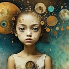 A young girl with expressive eyes and tousled hair is surrounded by glowing golden orbs. She wears a delicate dress and holds a small trumpet, exuding an aura of enchantment and mystery.