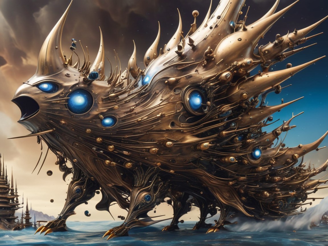 A massive, metallic fish leaps from turbulent ocean waters, its sharp teeth and spiky fins glinting under a dramatic, cloudy sky. The scene is both striking and surreal.