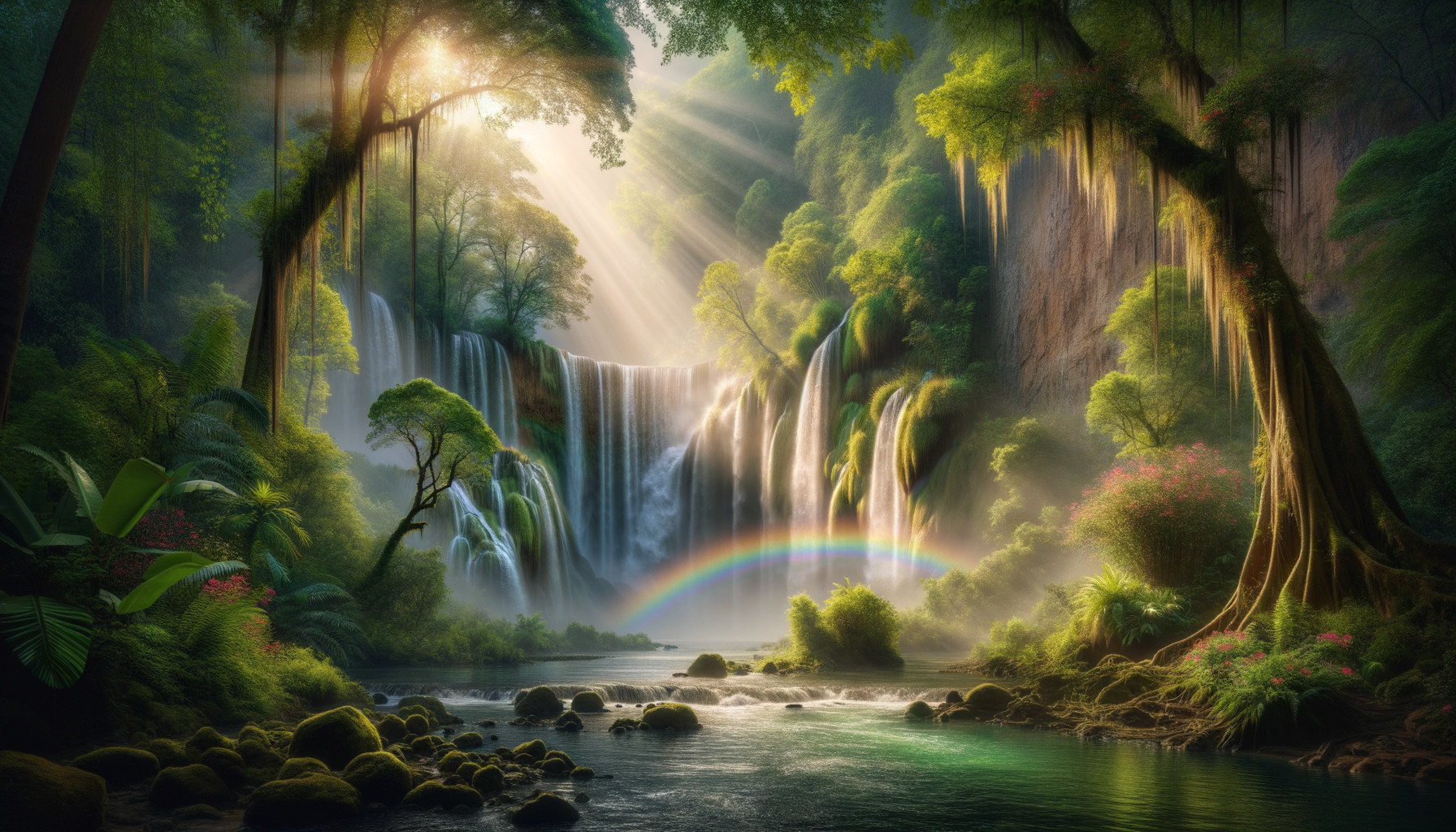 A serene waterfall flows through a lush forest, with mist hovering among the verdant foliage and moss-covered rocks.