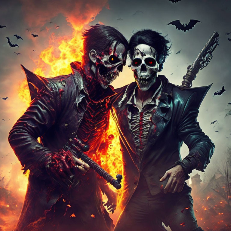 Glowing red-eyed skeletal figures in formal attire with bats on fiery backdrop
