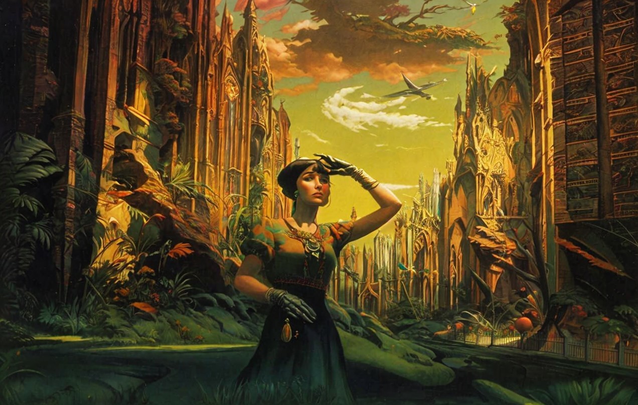 A fantastical landscape features towering gothic spires among ruins, bathed in warm sunset hues. A massive fallen tree arcs gracefully through the scene, enhancing the mystical atmosphere.