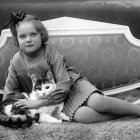 A young girl sits on a striped blanket outdoors, dressed in a dark sweater and skirt, with a thoughtful expression. Her hair is styled with a headband, surrounded by fallen leaves in the yard.