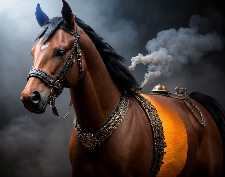 Majestic brown horse with fiery mane in ornate bridle and harness
