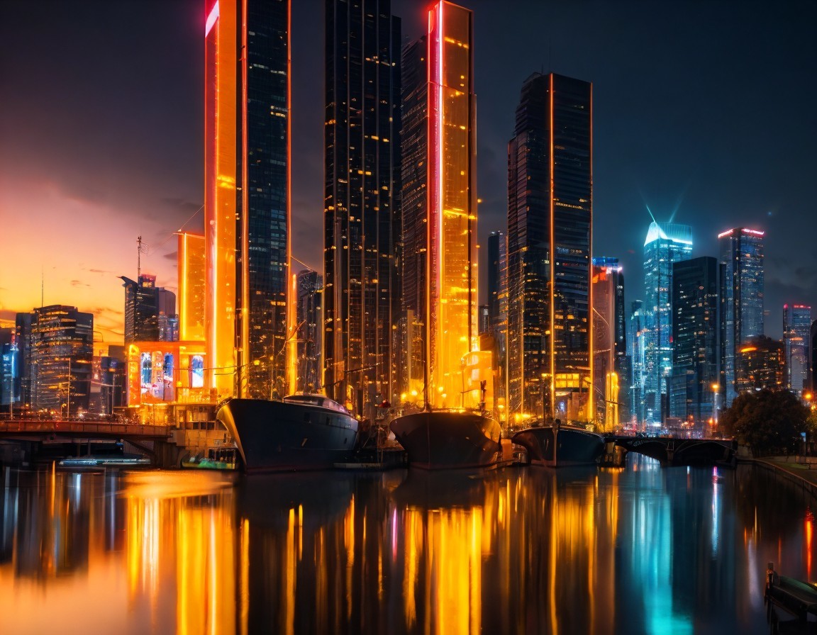 A city skyline at night with illuminated skyscrapers reflected in water, featuring warm lights and a modern bridge.