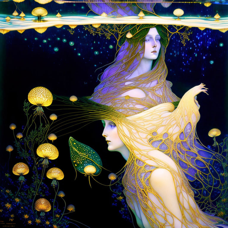 Beautiful Woman wading through shallow water in New Zealand Glow Worm Cave. Pre-raphaelite, mucha, Harry Clarke, George Méliès. Glow worms. Arachnocampa Luminosa.