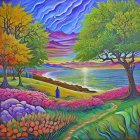 A vivid landscape features swirling, colorful fields of purple, yellow, and green. Two stylized trees, one golden and one bright green, frame the scene, creating a dreamy, vibrant atmosphere.