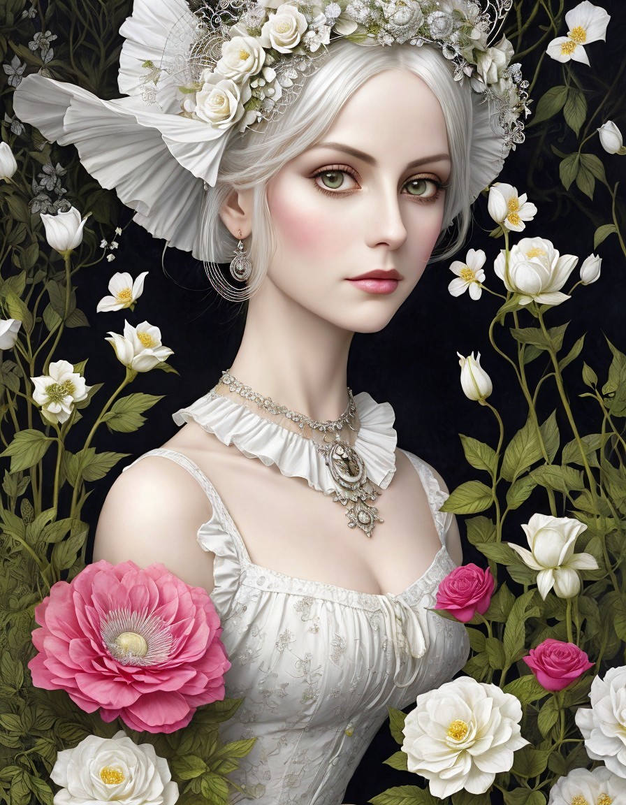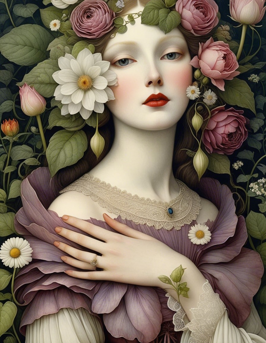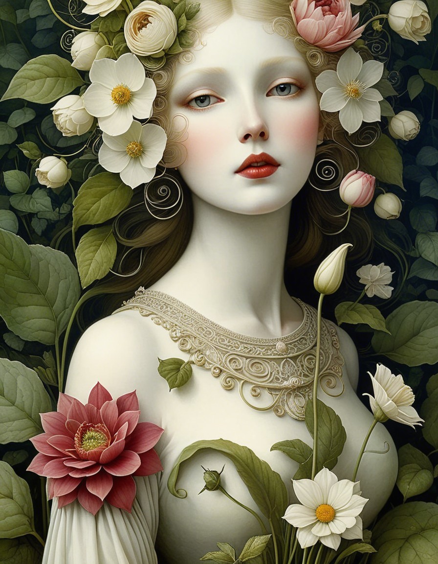 The image features a serene young woman adorned with flowers in her hair. Surrounded by lush greenery and vibrant blooms, her pale complexion and delicate features create an enchanting, ethereal atmosphere.