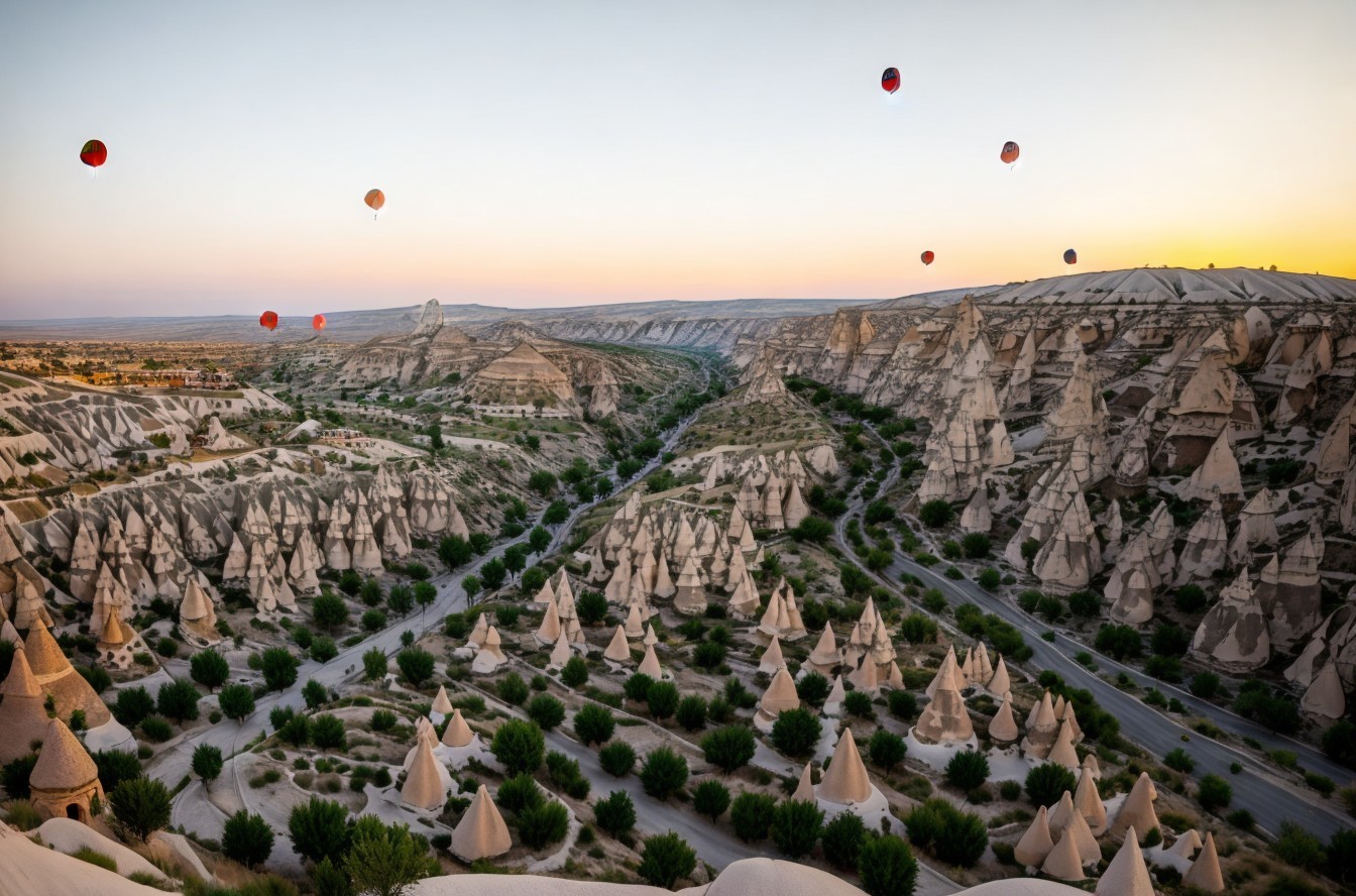 Panoramic sunset landscape with conical rock formations and scattered white houses