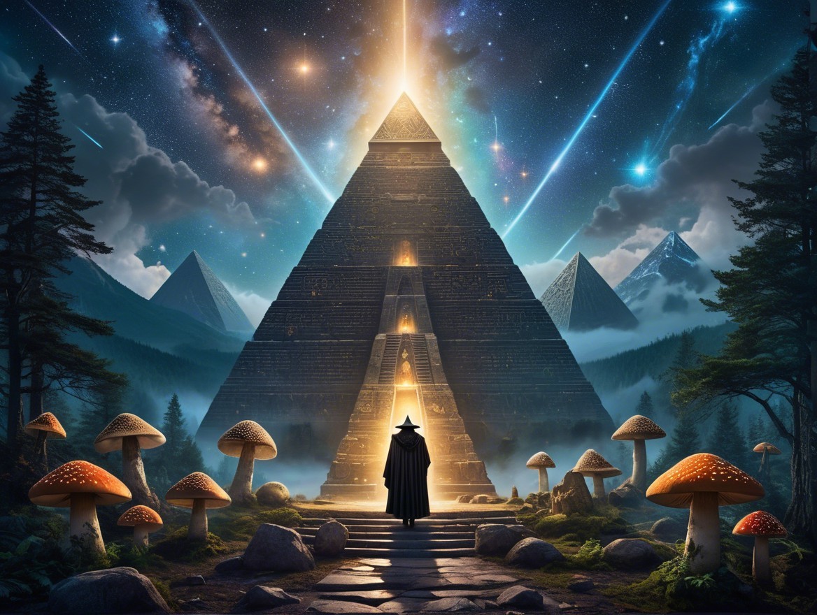 A mysterious wizard in a dark cloak stands at the entrance of a massive, glowing pyramid adorned with ancient symbols and astrological signs. The pyramid is surrounded by a mystical forest, where oversized, luminescent mushrooms grow, illuminating the foggy ground. In the background, majestic mountains rise against a starry sky filled with swirling galaxies and cosmic light, creating an otherworldly atmosphere. The scene conveys a sense of intrigue, magic, and the unknown, inviting viewers to explore the mysteries contained within the pyramid.