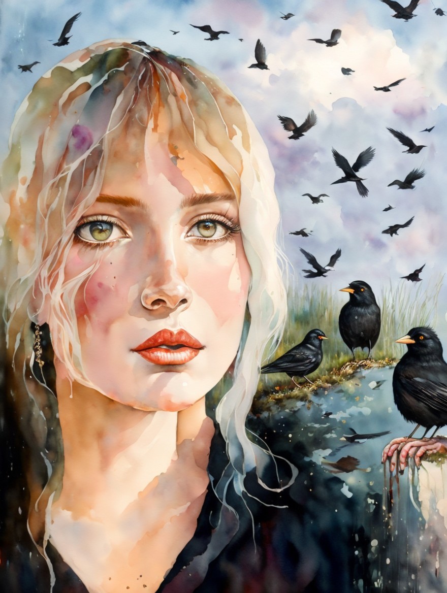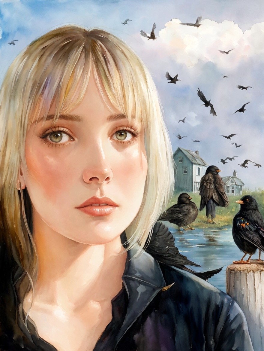 Prompt: A mirror world of woman looking toward an abandoned house and surrounded by blackbirds, mixed media oil and watercolor painting in the style of Margaret Bowland and Aleah Chapin